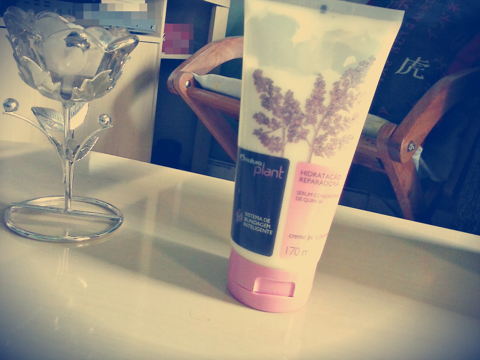 Hidratação Reparadora, Sérum Concentrado de Quinoa. Creme para pentear 170 ml. Confesso que não sou fan de creme para pentear, só uso mesmo shampoo, condicionador, máscara de hidratação (ou qualquer outra coisa do tipo que seja para hidratar). Não sou muito fan de creme para pentear porque meu cabelo é oleoso demais, e quando faço a hidratação já é o bastante pra deixar ele bem desembaraçado. Até mesmo quando não faço a hidratação o próprio condicionador já deixa meus cabelos desembaraçados, mas quis testar esse creme da linha Natura Plant. Além de ser super cheiroso (como toda a linha), eu achei esse creme muito pesado. Para os meus cabelos ele serve como uma máscara de hidratação, ou seja eu tenho que usar bem pouquinho dele e para ter um melhor resultado preciso enxaguar os cabelos. Eu gostei muito do resultado que ele faz, mas pra mim ele funciona mesmo como se fosse para fazer a hidratação (por ser muito pesado). É um creme bem homogêneo, bem pastoso mesmo, uma delícia que só. Ele hidratou muito meu cabelo, deixou brilhoso e solto. Mas foi como eu disse, ele só serve pra mim como um creme de hidratação, pois se eu usar como creme de pentear meu cabelo fica muito carregado, e acaba ficando oleoso, seboso e feio. Na minha opinião ele funciona super bem, porém como se fosse uma máscara de hidratação.